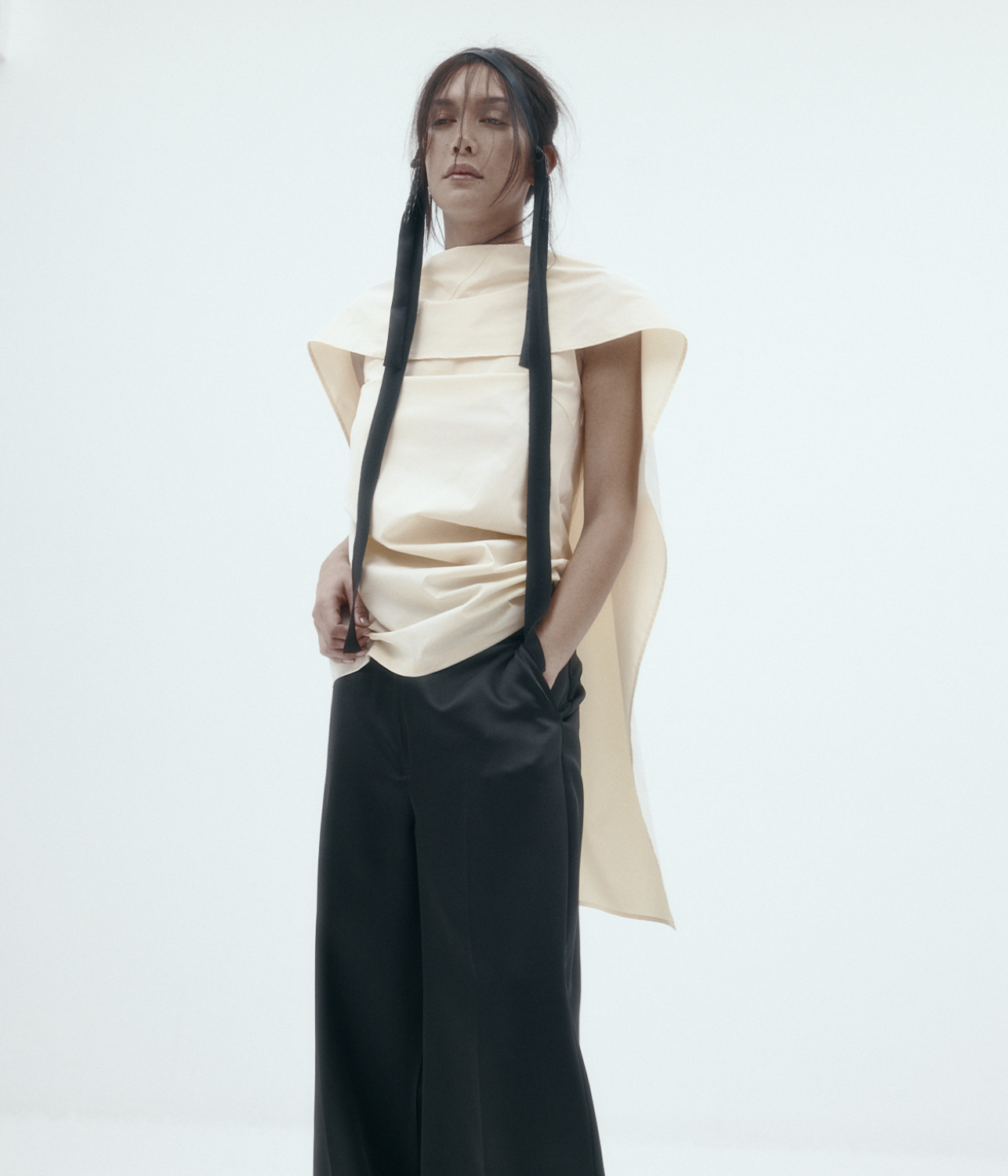 A sculptural silhouette built in tech taffeta with tuck detailing at the waist. Sash panels drape across the shoulders, cascading down the back or tying softly into a half knot.